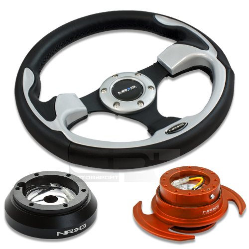 NRG-SRK-160H+001SL+650OR, NRG Innovations 12.5" 320mm Black Leather Silver Trim Racing Steering Wheel Combo with 6 Hole Short Hub Adapter with Gen 3.0 with Handle Orange Quick Release Kit SRK-160H